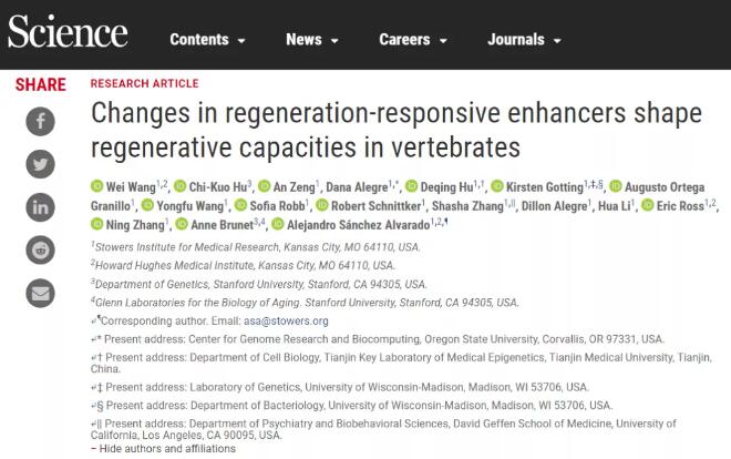 【转自BioArt】2020年9月4日,美国斯托瓦斯医学研究所(Stowers Institute for Medical Research)、霍华德·休斯医学研究所(Howard Hughes Medical Institute)的王伟博士、Alejandro Sánchez Alvarado院士(美国国家科公司,美国艺术与科公司)与斯坦福大学Anne Brunet教授团队合作在Science杂志上以长文形式发表了题为 Changes in regeneration-responsive enhancers shape regenerative capacities in vertebrates 的研究。该研究首次引入新再生模型——非洲鳉鱼(African killifish Nothobranchius furzeri,图1),通过比较研究提出解释动物再生能力丢失的基于再生响应增强子(regeneration-responsive enhancer)的理论模型 (图2)。