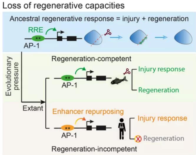 该理论认为原始再生响应增强子(ancestral regeneration-responsive enhancers)的功能是激活组织再生,该过程包括损伤响应(injury response,可以启动伤口愈合)和再生响应(regeneration response)。然而在进化和物种形成(speciation)过程中,激活损伤响应和再生响应的功能在一部分再生响应增强子中被分离。在有些动物中,再生响应增强子仍保留激活损伤响应和再生响应的功能,因而这些动物保留再生能力。然而在另一些动物中(包括人类),再生响应增强子由于增强子功能性调整(enhancer repurposing)发生了变化,致使他们只能激活损伤响应而不能激活再生响应,因此丢失了器官再生能力。