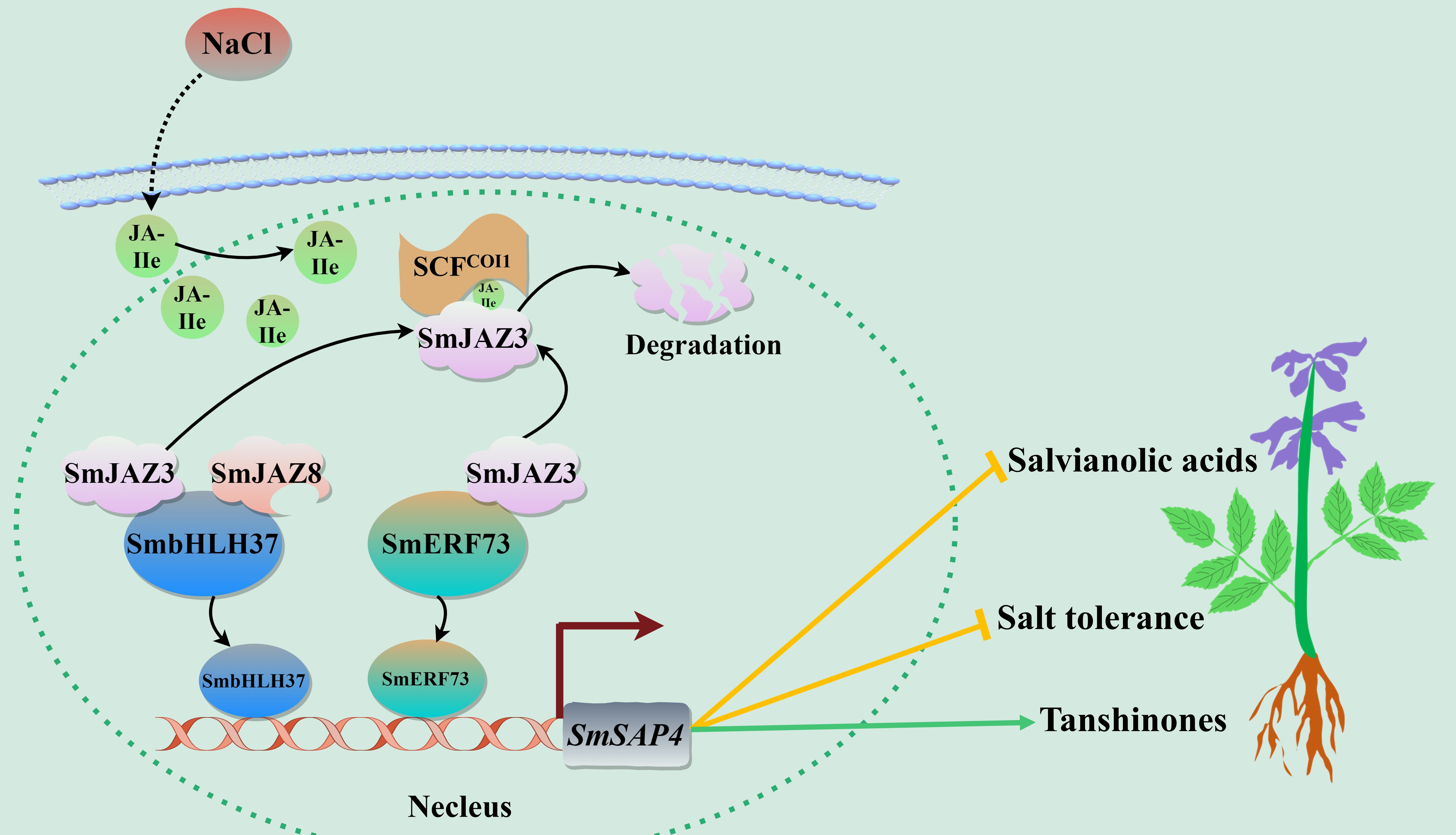 SmJAZs-SmbHLH37/SmERF73-SmSAP4模块介导JA信号通路平衡药用代谢物的生物合成和耐盐性的模型图