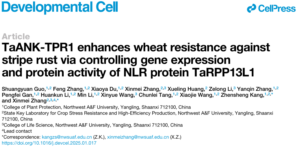 近日,康振生院士/张新梅副教授课题组在Developmental Cell发表题为“TaANK-TPR1 enhances wheat resistance against stripe rust via controlling gene expression and protein activity of NLR protein TaRPP13L1” 的研究论文,揭示了植物免疫新成员TaANK-TPR1通过调控NLR蛋白TaRPP13L1的转录表达及蛋白活性进而增强小麦抗性的分子机制。